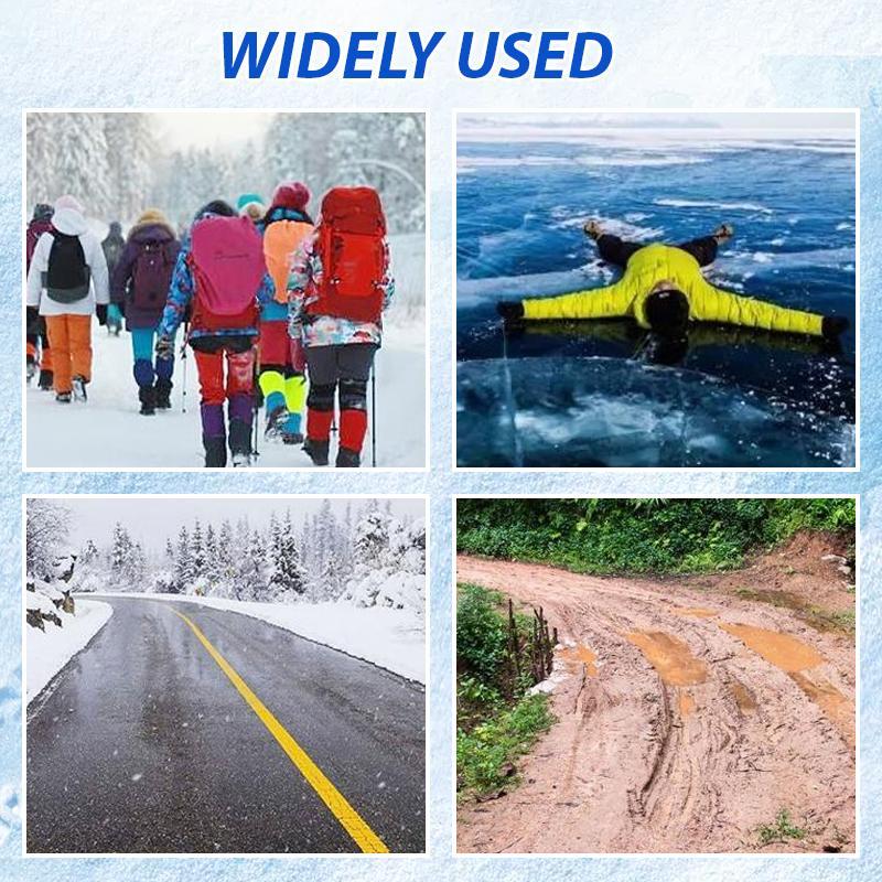 Suitable for men and women of all ages, including teenagers, adults and seniors. Used on sloping terrain, icy roads, muddy and wet grass or other harsh conditions, such as hiking, rock climbing, fishing, mountaineering and other outdoor activities, protecting you and your family from slipping.